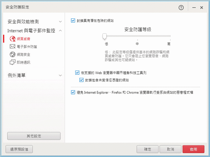 【▼】在網際網路與電子郵件監控的部分,提供了網頁威脅的低、中、高防護、電子郵件防護、網路安全與AOL、YAHOO兩款即時通訊軟體。