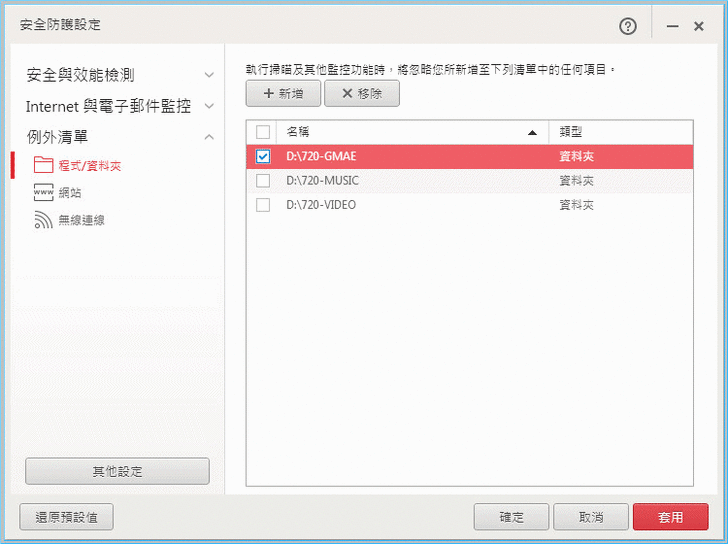 【▼】軟體不是萬能,有時候還是會誤判,趨勢PC-cillin 2017雲端版特別提供了例外清單的選項,可以讓用戶排除特定程式或資料夾、網站或是Wi-Fi連線等。排除特定程式的情況比較會在使用破解檔的情況下發生(小編不鼓勵使用非法軟體,要尊重智慧財產權唷)!而可以針對我的最愛來匯入排除清單,小編覺得是蠻便利的。