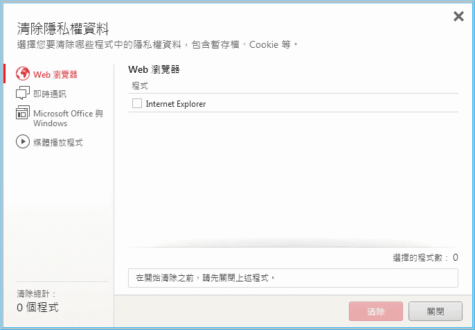 【▼】在清除隱私權資料的優化中能針對瀏覽器、即時通、微軟Office與Windows、多媒體播放程式作瀏覽記錄、聊天內容、暫存檔與Cookie作清除的動作。