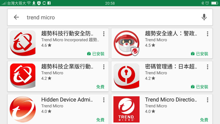 【▼】不論在Google Play或Apple Store搜尋trend micro就能找到趨勢科技所推出的App,紅色是趨勢科技的主要代言,由於是個人使用這邊建議安裝【趨勢科技行動安全防護】,若您是企業用戶則可選擇【趨勢科技企業版行動安全防護】,至於【趨勢安全達人】很多功能與【趨勢科技行動安全防護】相近,這邊小編會針對特殊功能作些說明。