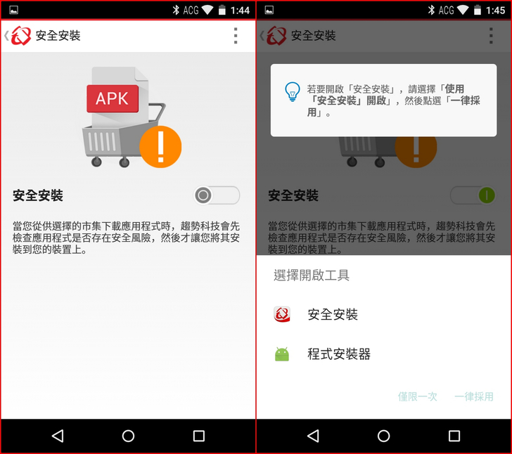 【▼】開啟後,若不是從Google Play下載的App,之後都能先以【安全安裝】進行APK安裝檔的掃瞄,掃瞄無疑後就能進行App的安裝。