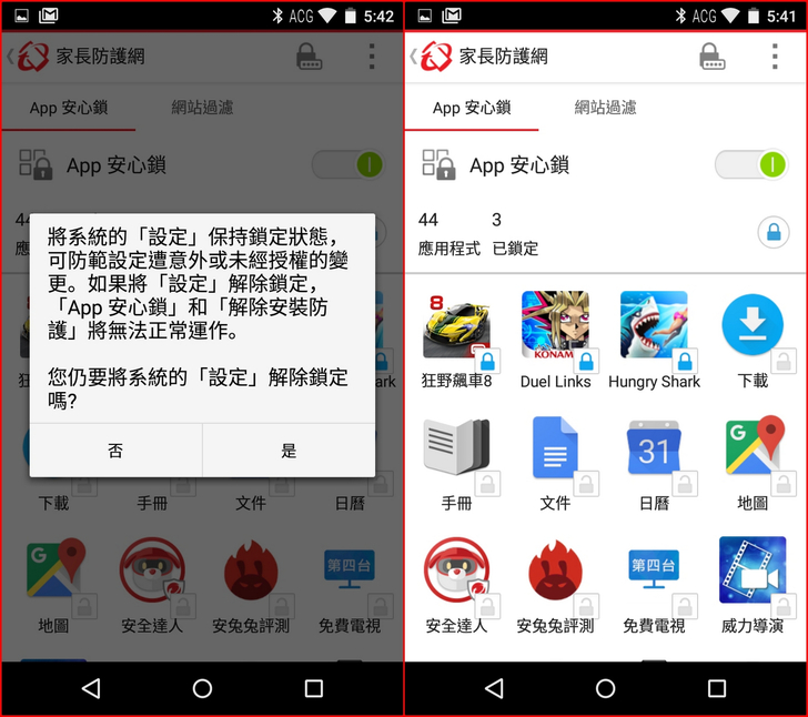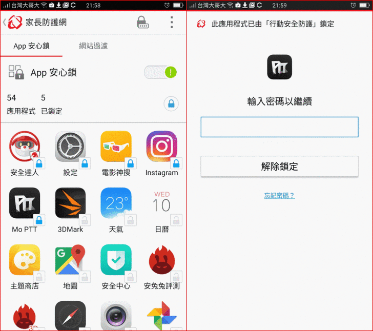 【▼】有習慣給小朋友手機的家長,建議一定要開啟【趨勢科技行動安全防護】->【家長防護網】,除了可以鎖定App亦可以進行網站過濾,經App安心鎖鎖定的App,啟動前都會要輸入密碼,密碼不對就無法執行,間接讓小朋友養成不沉迷遊戲的好習慣。