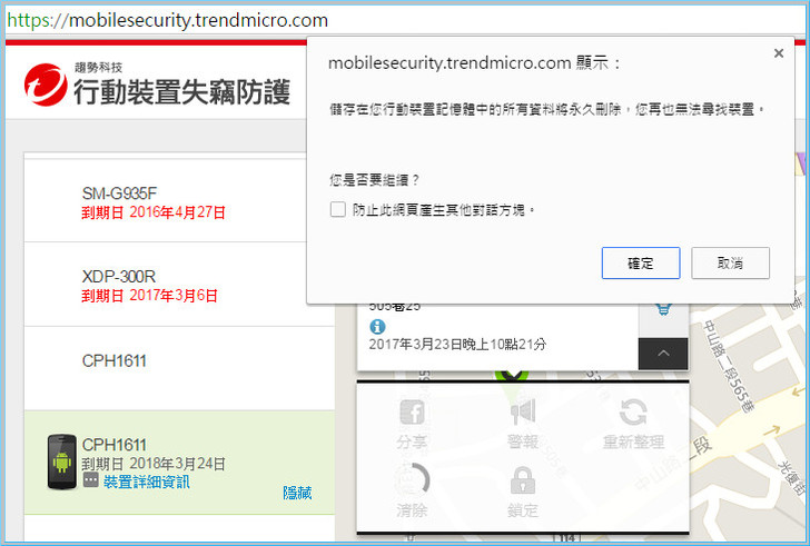 【▼】在行動裝置設定好之後,若真的手機遺失,就先到失竊防護入口網站https://mobilesecurity.trendmicro.com/ 輸入趨勢的帳密,就可找尋或做其他處置。
