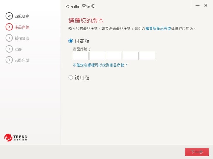如果已經購買,就選擇付費版,輸入產品序號後,再按下一步。