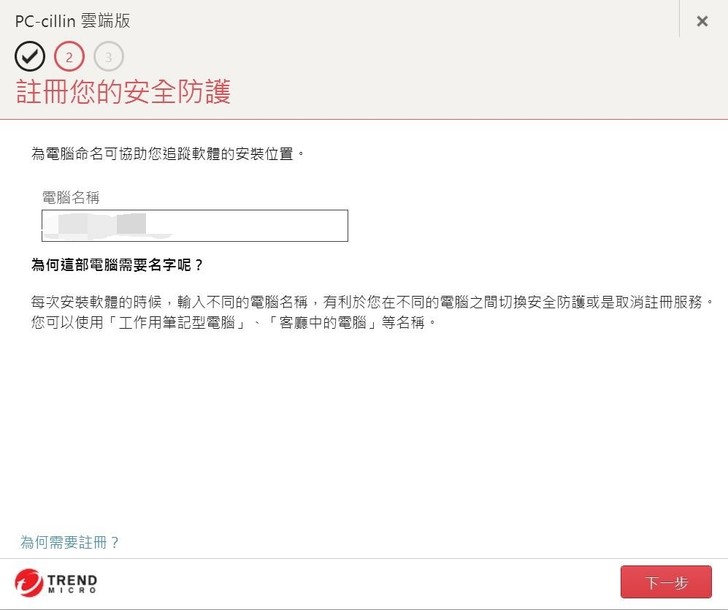 接著會出現電腦名稱,PC-cillin 2017會自動抓取,除非你還想修改,不然就用這個名稱即可,這也是PC-cillin 2017軟體人性化的另一個證明(電腦名稱的部分我已經馬賽克處理,它會自己出現,不用自己打字,不用擔心)。