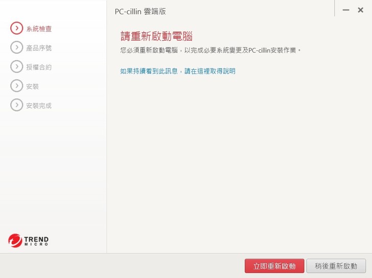 移除完成後,一般都需要重新開機,你只要照建議按一下「立即重新啟動」,PC-cillin 2017會自動重新開機,然後又再重新啟動安裝程式,你也不需要再自己去重新啟動安裝程式。