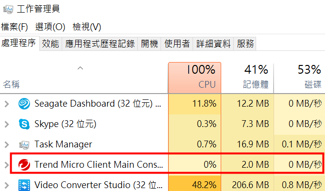 在軟體運作的過程中,我可以一直看到PC-cillin 2017的CPU使用率一直都是在「0%」,不要覺得不可思議,請看: