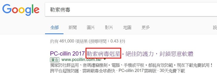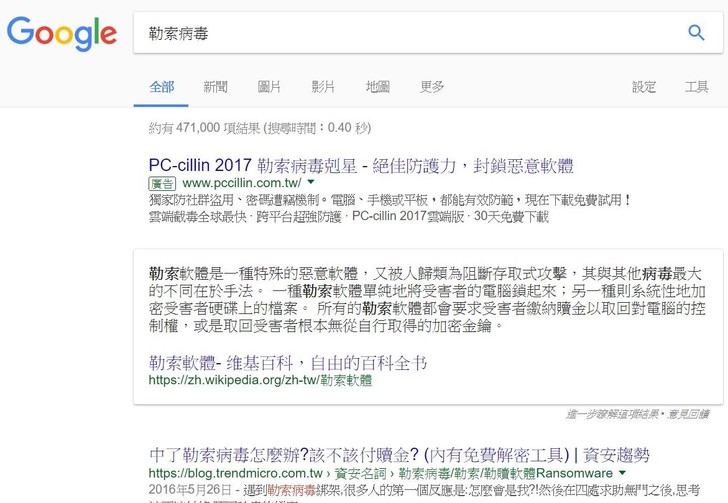 現在,我們在google搜尋「勒索病毒」,會得到這樣的畫面: