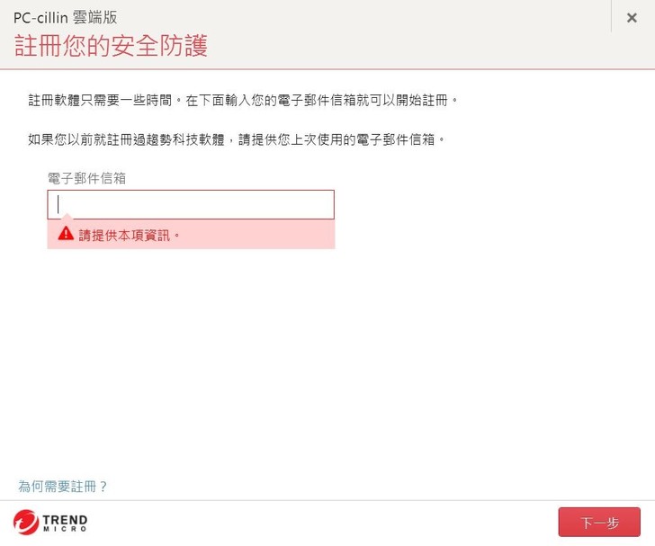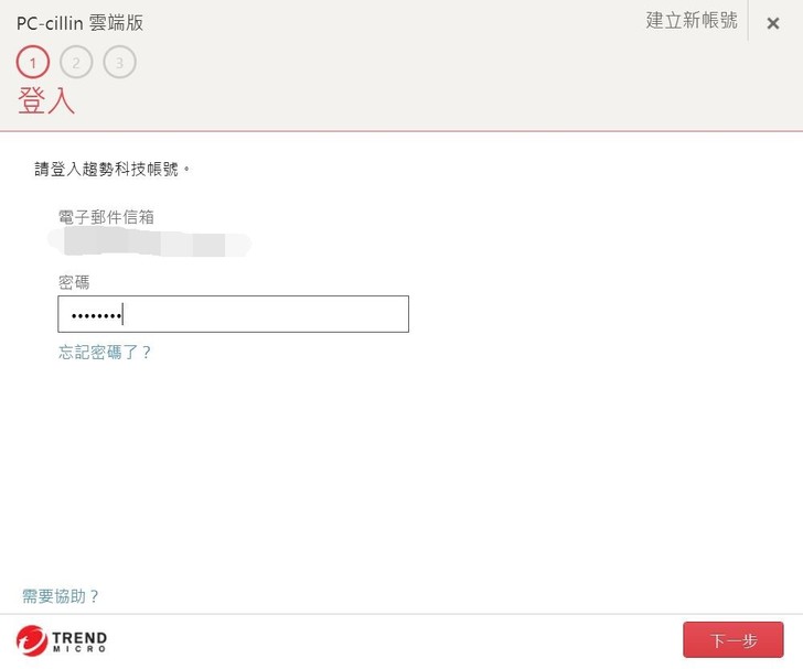 接下來是註冊軟體,由於我之前就曾註冊過PC-cillin,所以在下個步驟只需要填入之前註冊的電子郵件信箱和密碼即可。