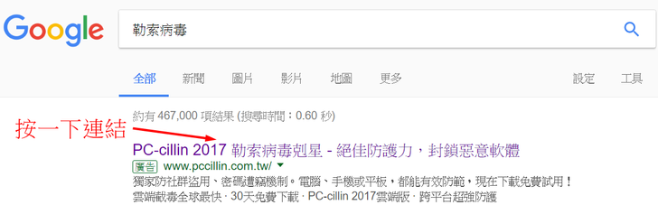 你可以在Google上搜尋「勒索病毒」,會得到下面的搜尋結果: