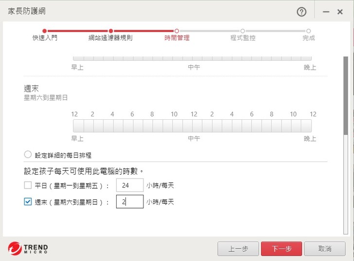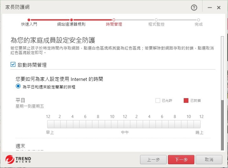 過濾器規則己經設定好了。接下來因為現在的小孩太小就接觸到3c產品,若電腦看太久視力很容易看壞,而且若有時跟小孩的媽媽聊開了,根本就忘記小孩到底上網上多久了,這時PC-cillin家長防護第三步驟就派上用場了,PC-cillin第三步驟可以選擇使用的時間,讓小孩不會一直掛在網路上,媽媽也可以很放心的做自己的事情,不會一直有事情掛在心上。