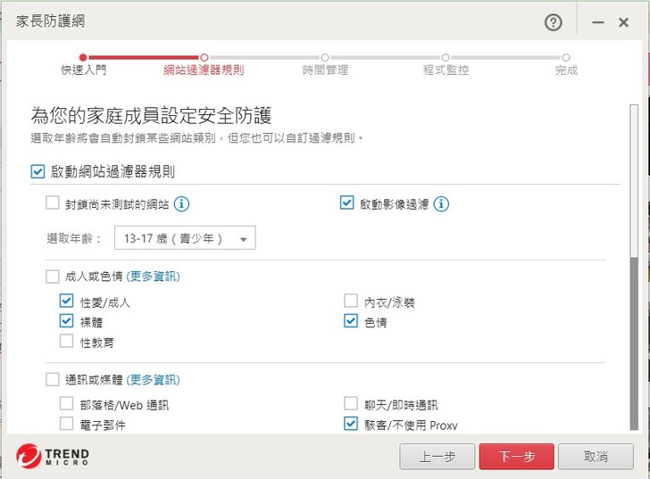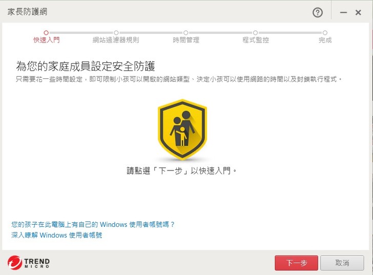 PC-cillin 2017的家長防護設定方式還滿簡單,首先先到PC-cillin 的家長防護功能畫面,其實PC-cillin設計了一個簡單的操作精靈,所以只要看的懂中文,都可以輕鬆的設定。
