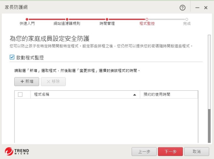 接下來的功能來到程式的監控,對於小孩除了需要網路上的限制外,電腦裡當然也是有一些程式的遊戲,所以PC-cillin中的家長防護網真的做的很好,它連各別的程式都可以設定限制使用。