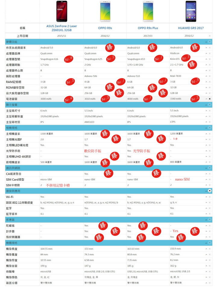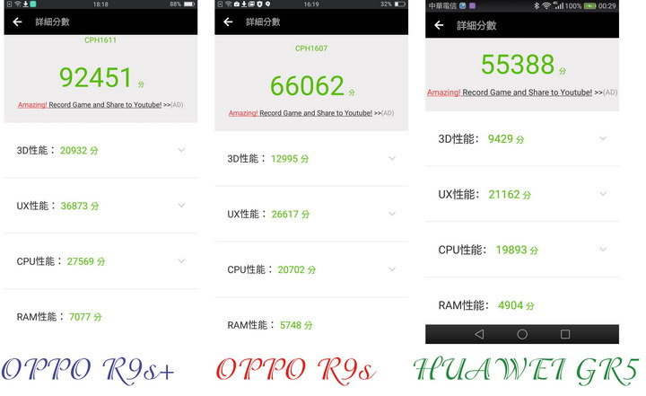 OPPO R9s與Huawei GR5 2017則是相當, 分不出上下