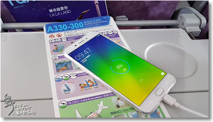 ▲上了飛機發現忘了幫手機充電,幸好OPPO提供了VOOC閃充,馬上用機上的插座迅速幫兩支手機充滿電力,VOOC真的是外出旅遊的好幫手。