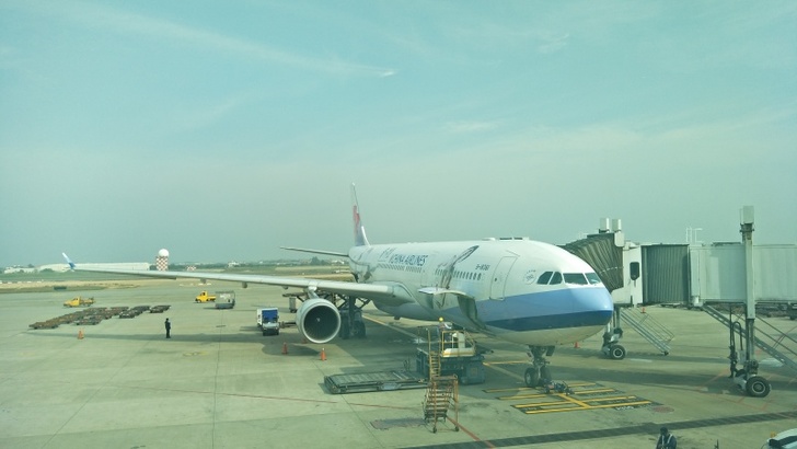 ▲今天出發就是華航的A333雲門機,二航廈的玻璃隔熱紙讓天空顏色有點偏綠。