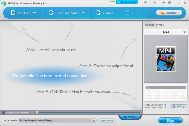 安裝完之後執行 HD Video Converter Factory Pro 首先會看到簡單的使用說明: 1.你可以從電腦中選擇影片檔或是從網路上下載也可以用拖曳的方式進行影片轉檔的處理 2.選擇要轉換的格式 3.點選 「RUN」開始轉檔,另外轉檔輸出的資料夾也可以在底下的 Output Folder 進行選擇。不過在正式操作軟體之前先進行註冊吧,在軟體右上角有一個 Register 的按鍵點選進入之後將說明文件中的啟用序號複製貼上再點選旁邊的 Register 就完成註冊了。