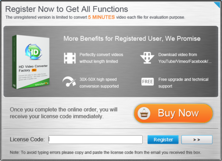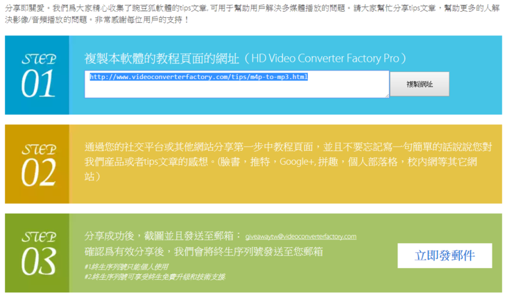 雖然本質上 HD Video Converter Factory Pro 仍舊算是試用版的軟體,雖然全部的軟體功能都可以使用不過並無法升級,印象中第一次使用後會有促銷終身免費版(完全版?)的介紹。不過 WonderFox 設計了一個有機會得到終身免費版的活動只要分享軟體的教程頁面的網址,並且簡單寫下軟體的介紹或感想,分享到 Facebook、Twitter、部落格等地方皆可,然後截圖寄信到 giveawaytw@videoconverterfactory.com,經過審核後就有機會得到 HD Video Converter Factory Pro 終生版序號,未來軟體都可以直接升級使用,並且有官方的技術支援。