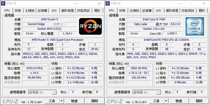 R5 1400 / 4C8T VS i5 7400 4C4T 皆為預設之時脈當作測試基準參考