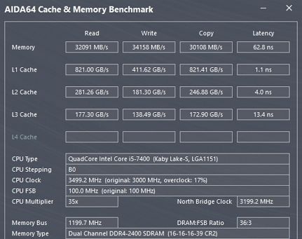 i5 7400︰讀取 32091 MB/s 寫入 34158 MB/s 複製 30108MB/s