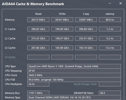 R5 1400︰讀取 36313 MB/s 寫入 36161 MB/s 複製 33097MB/s