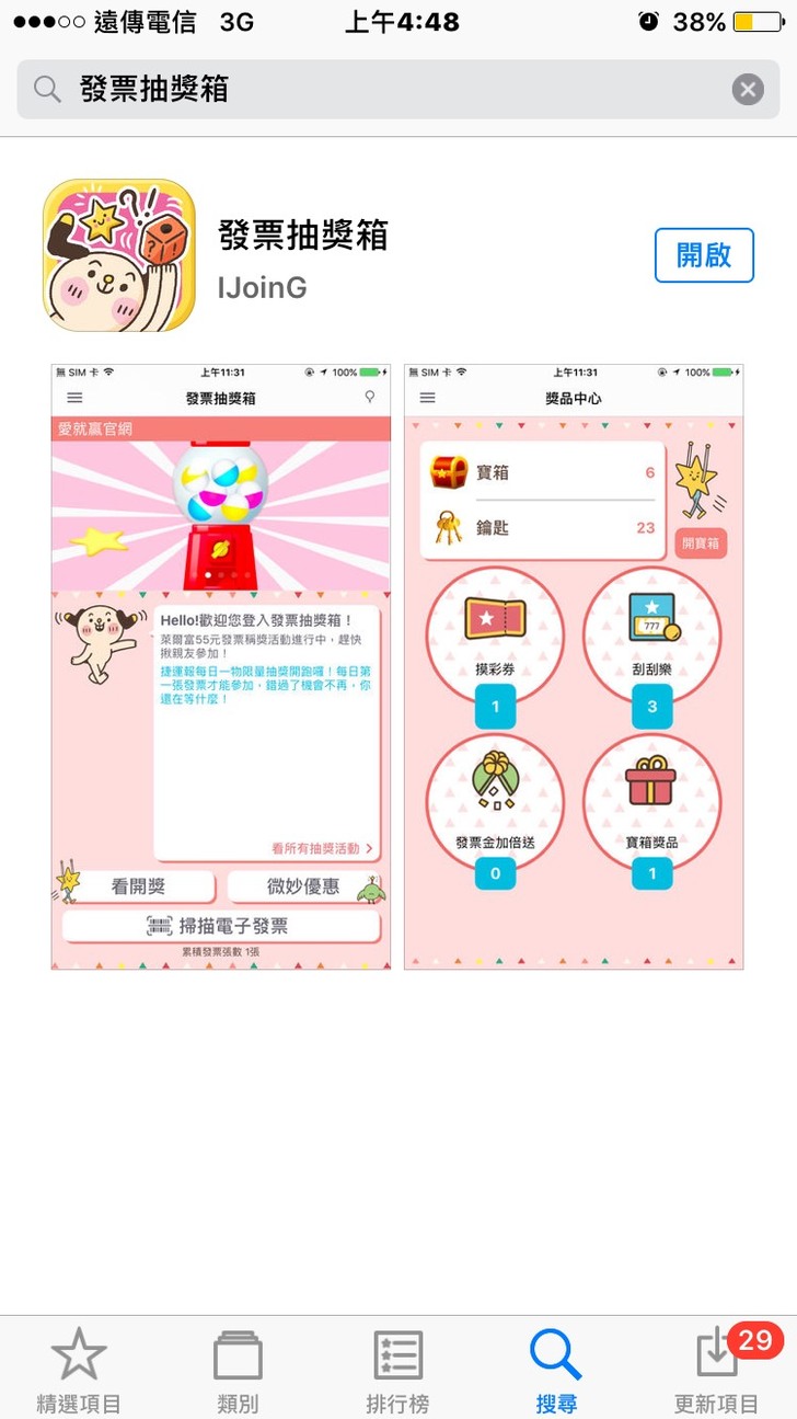 前陣子網路爬文找方便兌發票的APP, 發現滿多人推薦這款---------------------發票抽獎箱APP!!! 一邊登錄發票兌獎,還可以一邊抽寶箱~ 我覺得中獎機率還滿高的,所以來分享一下 目前中到超多遊戲虛寶, 還有茶葉蛋,養樂多, 美妝折扣﹐巧克力等等~這樣算下來,就算發票本身沒中獎 這些獎品算一算也中了200塊的等值商品~(灑花~~~~) (跟我自己拿中兩百的發票去便利商店換一樣~~) 更多精彩文章請搜尋Mage的部落格https://goo.gl/hX1Zwf 讚 收藏 快速回應 引言回應