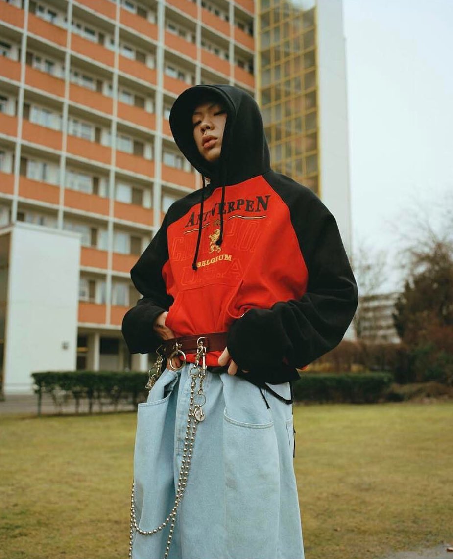 而創作歌手吳赫的oversize連帽上衣採用紅、黑對比色的搶眼設計,看起來更有個性、看起來一點也不會笨重!