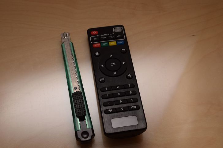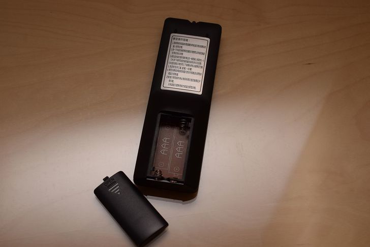 附贈的遙控器僅一隻美工刀的大小,也能切換成滑鼠模式使用,需要吃兩顆4號電池,可以用乾電池或者充電電池