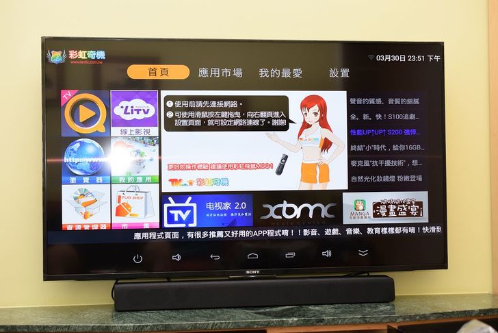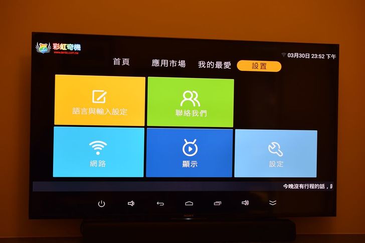 彩虹奇機S100開機後的畫面,啟動非常快速,分為首頁/應用市場/最愛/設定等四個主控區
