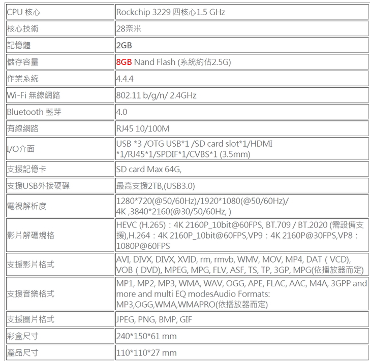 四核處理器Rockchip 3229 主打以CP路線,支援的4K解析度