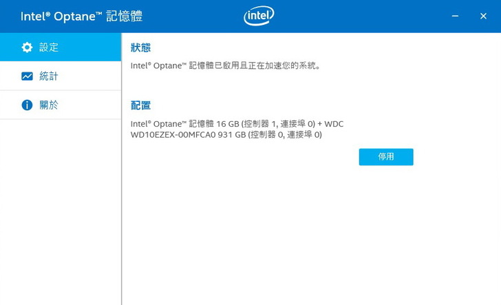 ▼ 開啟 Intel Optane Memory 軟體,除了狀態顯示 Intel Optane Memory 啟用且加速外,配置 更可以看到 Intel Optane Memory的容量及加速的硬碟容量。