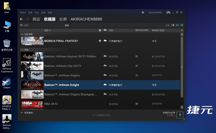 ▼ 筆者在 捷元宙斯機 上面安裝 二款遊戲:《MOBIUS FINAL FANTASY》、《蝙蝠俠:阿卡漢騎士Batman: Arkham Knight》