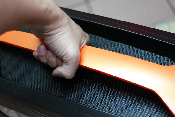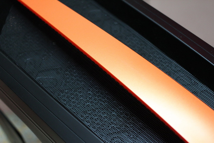 ▼ 捷元宙斯機 頂部:網狀設計可幫助散熱、提把設計有助於搬運主機、凹槽設計可放常用的小東西。
