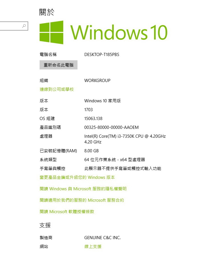 ▼ 系統:Windows 10 家用版 64位元、CPU為Intel Core i3-7350K、記憶體 8GB。