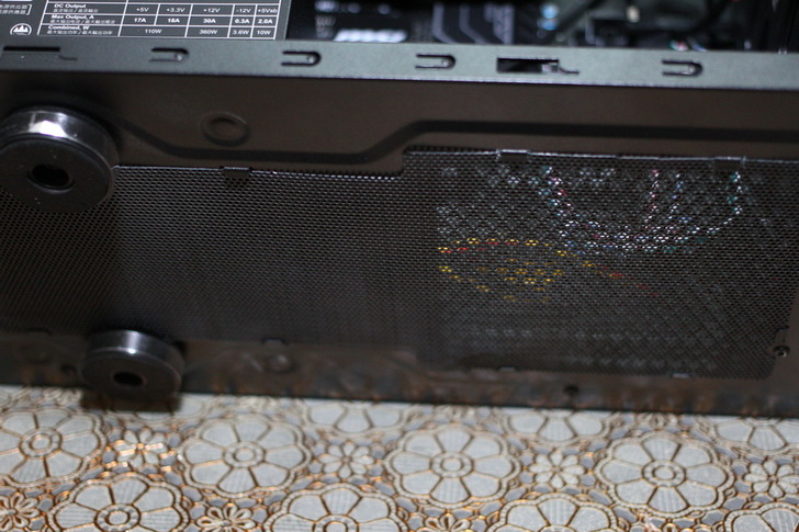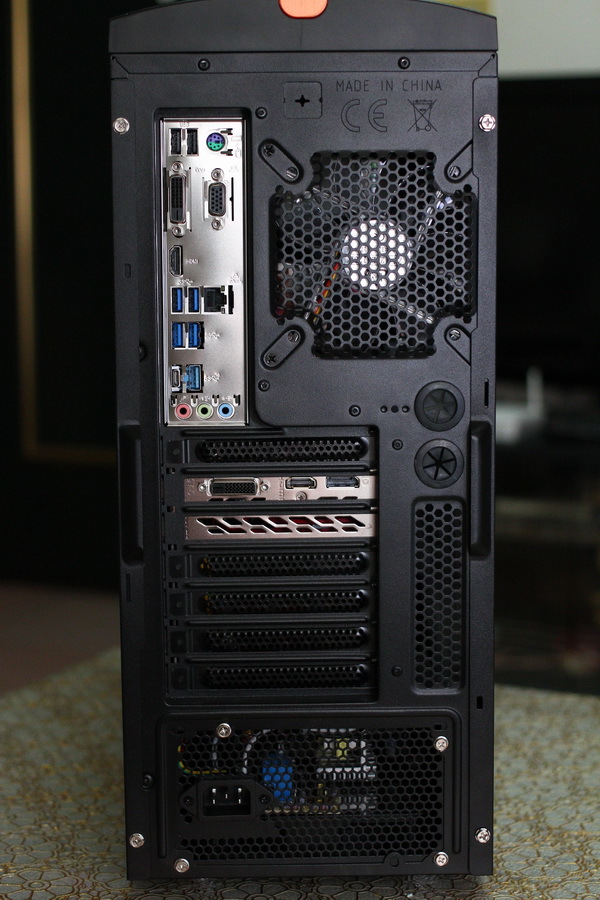 ▼ 捷元宙斯機 背面:後置一顆散熱風扇、主機板豐富的I/O、顯示卡支援三種輸出埠、下置式電源供應器。