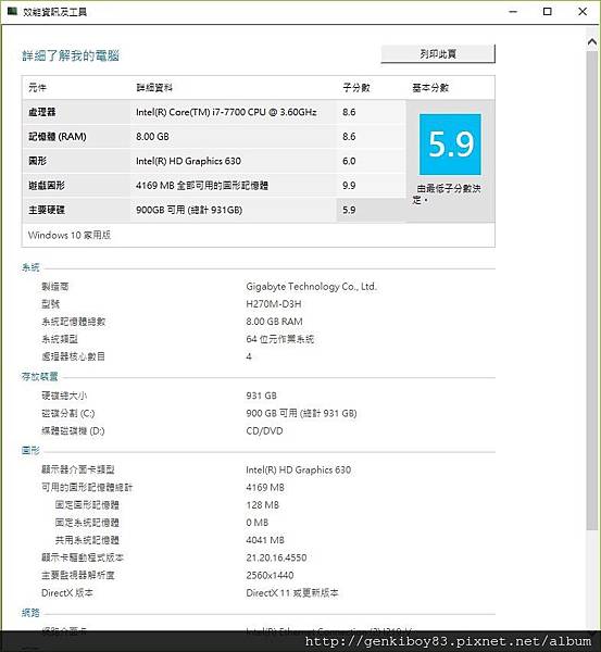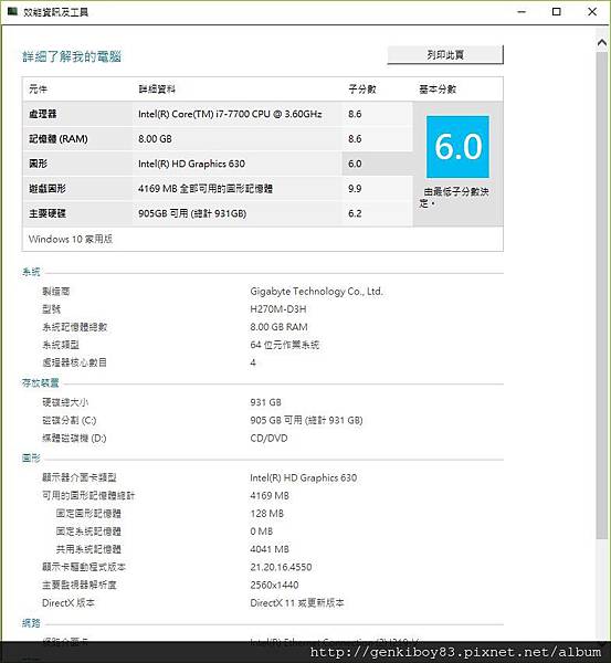 測試前先來驗明正身~看看整台機器的配置,系統部分是最新的 Win 10 1703 creator 版本,最近綁架病毒猖獗,這版本的安全性相對高!CPU 則是 i7-7700 3.6GHz 的版本,8G RAM,顯卡是 HD 630 內顯。