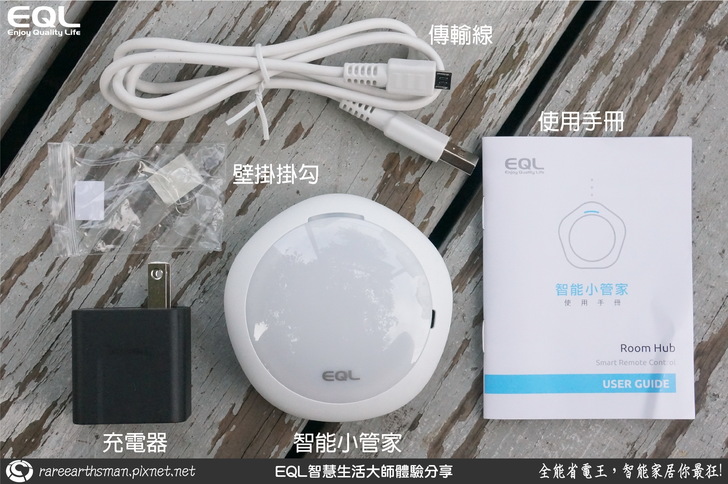 ▲智能小管家開箱後內容物有智能小管家本體、使用手冊、充電器、USB Type-b傳輸線及小小的壁掛掛勾。