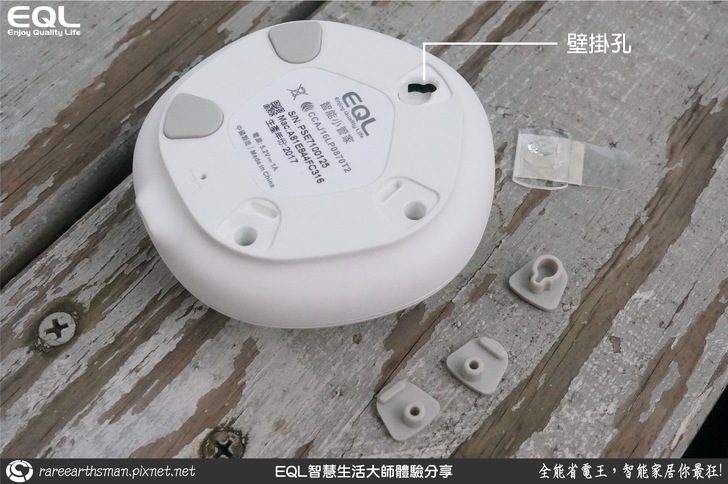 ▲智能小管家底部的橡膠墊全部都可以取下,中央上方的橡膠墊下方就是壁掛孔,使用上僅需要先將附件裡的壁掛小掛勾連貼在牆上,然後將智能小管家背面的壁掛孔對準小掛勾就完成壁掛動作。而這顆掛勾是3M公司生產的,型號是37026,如果需要更換就請直接買3M的這款掛勾即可。另外4顆橡膠墊下方是螺絲孔,固定外殼與內部零件用。