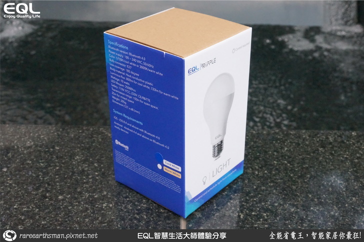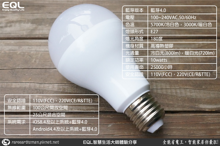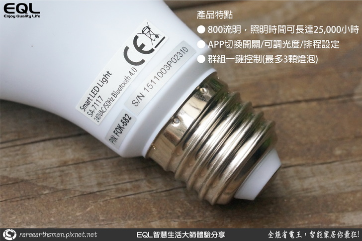 ▲在EQL智能家居系統裡面,智能燈泡應該是屬於最容易貼近消費者的產品了,因為電燈泡應該每家每戶都有吧,雖然現在市場上有許多種的燈具可以選擇,但燈泡還是滿多家裏愛用的形式,像是在浴室、走道、甚至是陽台,應該很容易看見燈泡的蹤影。而EQL的智能燈泡可以透過藍芽的連線與智能小管家溝通,使用智慧型手機就可以直接操控燈泡的變化。