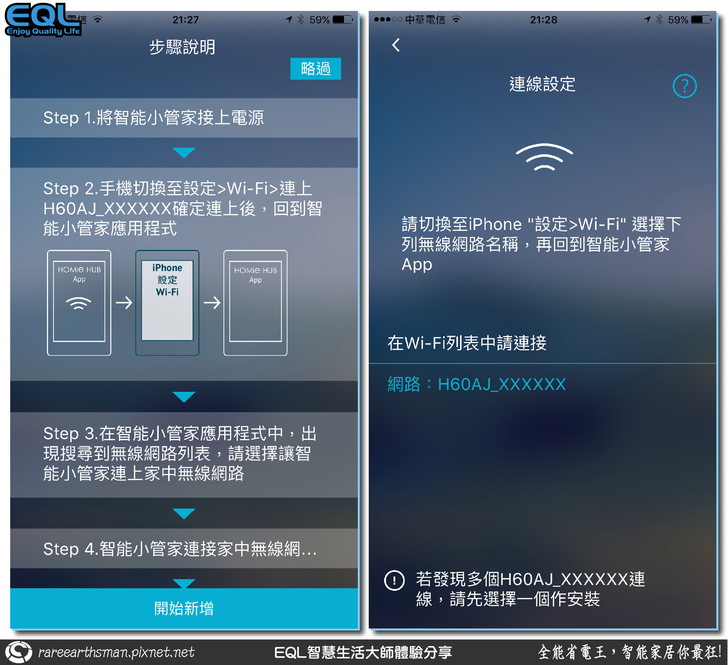 ▲搜尋到智能小管家之後,APP會跳出一個教學的頁面,因為要幫智能小管家連上家中的WiFi,所以要先用手機開啟手機的WiFi功能,搜尋H60AJ開頭的無線網路(這就是這台智能小管家本身的無線名稱),然後回到智能小管家APP裡面,APP的畫面會出現跟手機WiFi選單數量差不多的無線網路出現(事實上會少一點,因為智能小管家只能使用2.4G的部分,5G的WiFi是不會顯示的),這時選擇家中的無線網路,再輸入網路密碼之後就會開始連線了。而APP也會一步驟一步驟的引導使用者做連線設定,右邊就是引導使用者進入手機WiFi來選擇H60AJ開頭的智能小管家無線訊號。