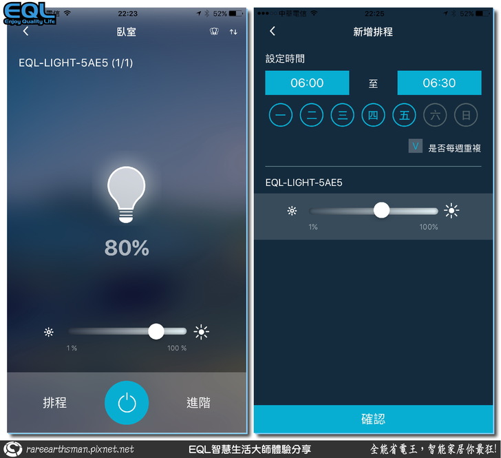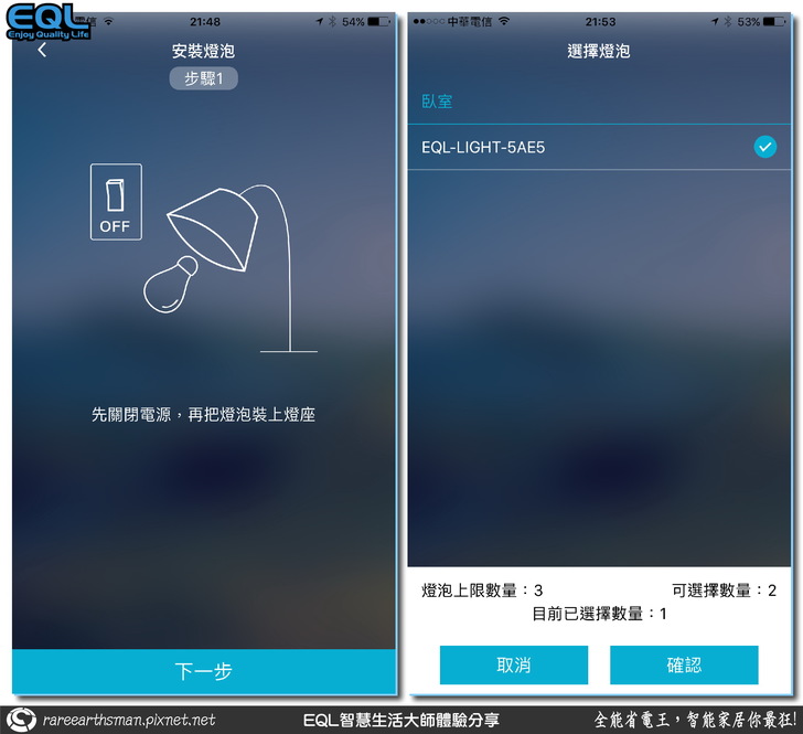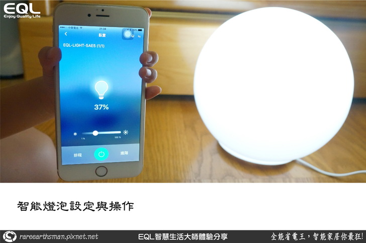▲智能燈泡的設定與使用都滿簡單的,在EQL智能家居系統中算是簡單,但是效果最明顯的產品,因為燈光的亮度大,用手機很容易地調整亮或不亮,甚至要多亮都可調整,整個房間的亮度都是可以控制的,這樣夠"明顯"了吧。