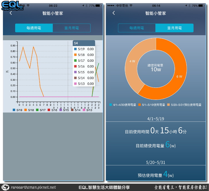 ▲用電紀錄頁面中有每周用電與當月用電兩種紀錄模式,雖然智能插座只能控制電器的開或關,其餘電器的控制都是不能操控的,但是這個開或關的動作卻可以讓使用者在家中任何地點就控制電器的是否使用,甚至不在同一地點就可以知道家中哪個電器是處於開啟的狀況,周圍是否有家人,是否就直接關閉不要浪費電,甚至用預設的時間來預先控制電器的開或關,這都是有效的節省電力的方法,同時也可以瞭解這個電器到底是不是浪費電力的家電,每個月會真正消耗多少的電力,想省錢真的要來裝一組呀。