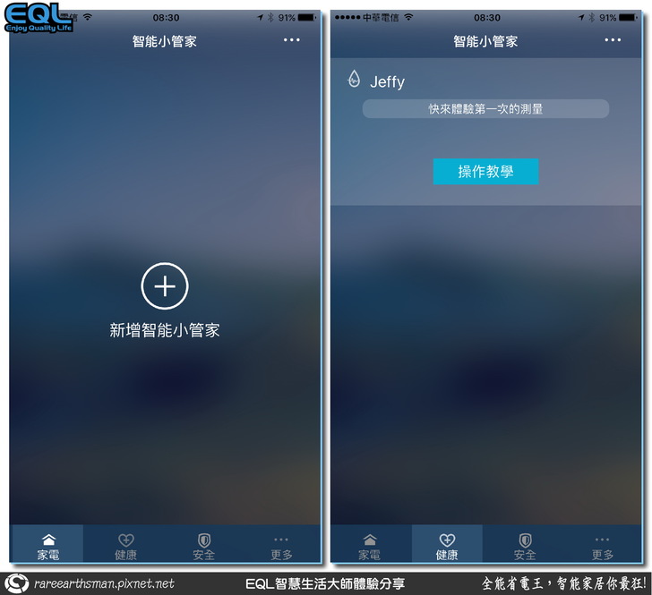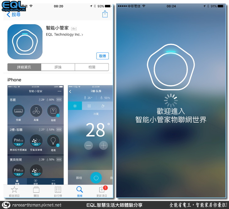 ▲EQL智能家居系統可以透過下載"智能小管家"APP來使用手機操控整個家電系統,市面上兩大手機系統,iOS與Android的手機只要符合最低系統要求,像是iPhone手機要iPhone5以上,iOS要至少8.4以上而Android至少要有4.3的版本,在App Store與Google Play都可以免費下載。右側是"智能小管家"APP開啟畫面。