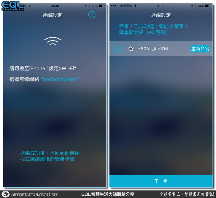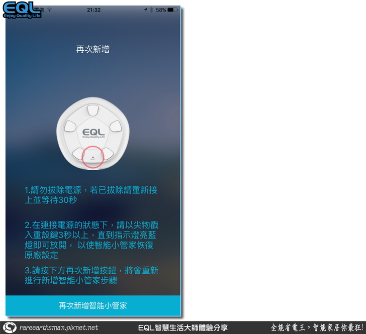 ▲如果在連線設定智能小管家的過程失敗會需要重新做連線,這時候需要先拔除電源後重新接上,並等待30秒鐘,然後拿迴紋針插入智能小管家底部的Reset孔3秒鐘,直到智能小管家的LED指示燈亮藍燈表示已經回復到初始的原廠設定,這樣就可以從新的開始連線設定;在這裡也建議一下除了家裡的無線訊號要穩定之外,在連線設定智能小管家的時候最好是在無線路由器的附近,這樣的訊號比較穩定,連線會比較成功;我家的無線路由器是放在客廳,但我嘗試跑到最裡面的房間來設定智能小管家,平常這間房間使用家中的WiFi是正常的,速度還可以,可是設定智能小管家時連線就有點慢,有兩次失敗的紀錄,第三次設定才成功。