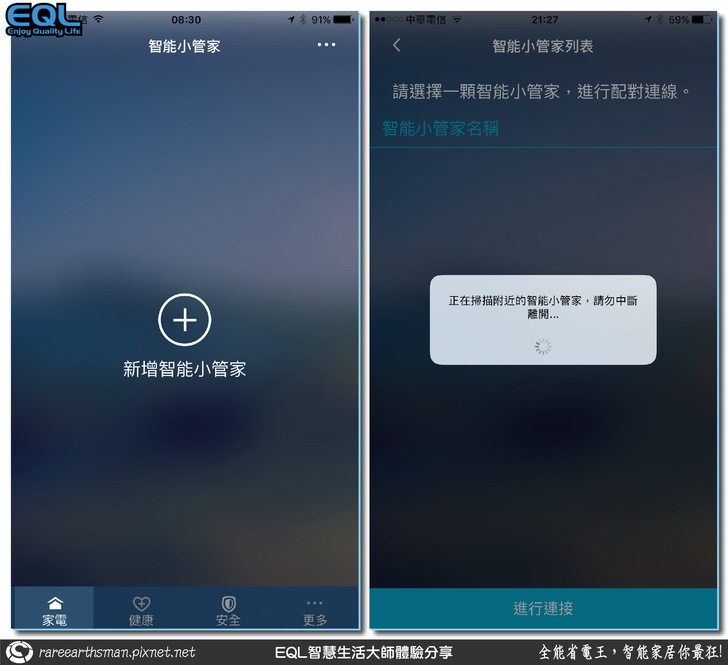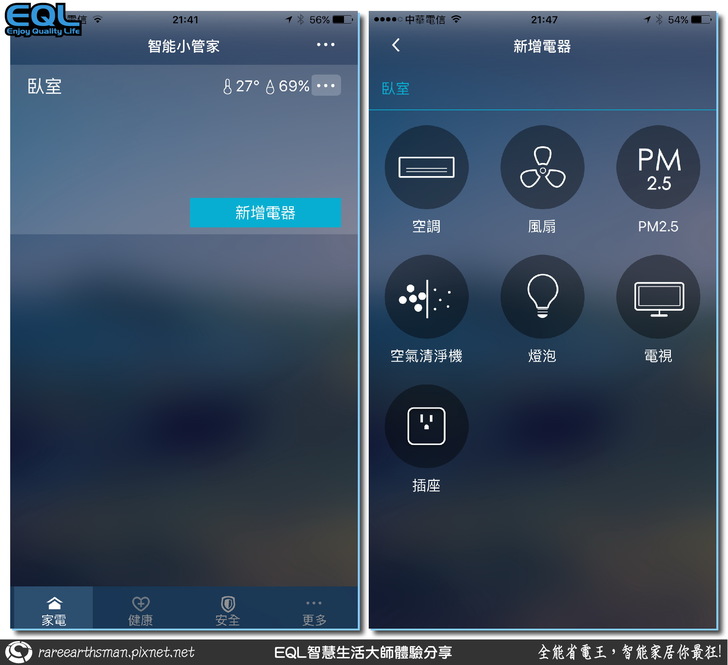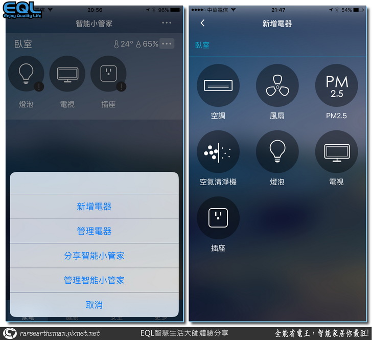 從智能小管家APP裡面的主頁面與新增電器頁面,看得出來EQL在未來的產品上有許多新產品的計畫,擴充一條完整的產品線會比單一產品智能化來得重要;試想,如果要找10個品牌廠商才能湊齊10項智能產品,同時手機上也會有10個不同的APP,甚至彼此之間還不相容,這時候如果有一家廠商有10種不同的智能產品,共用一個APP,系統互相整合控制,比較起來,似乎後者是比較好的模式,產品越全面、越多樣性,消費者接受的程度會更高。
