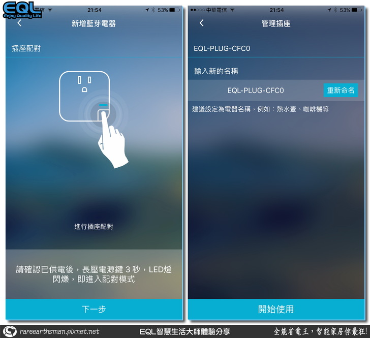 ▲智能插座在使用前要先跟智能小管家做藍芽的配對,首先在APP上要新增電器,然後按下"插座"Logo符號,然後將智能插座插在電源插座上,插在電源插座上時,智能插座是處於電源關閉的狀況,按下右下角的電源開關鍵3秒鐘之後,開關上方的LED指示燈就會開始閃爍進入配對模式,這時在手機APP裡面就會出現新的智能插座的名稱,就完成連線設定了,而這名稱也可以重新命名,像是要改成電風扇、熱水壺都可以。