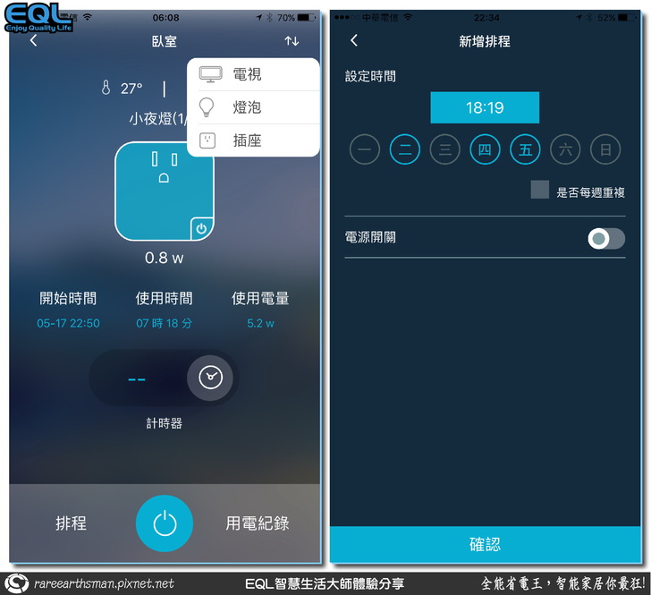 ▲左側的是電源插座的控制頁面,上方的小夜燈這名稱是可以更改的,插座符號下方會顯示電器使用的瓦數,並有開始時間、使用時間與使用電量的紀錄,畫面下方同樣有排程與電源開關,另外右下角新增了一個用電紀錄的按鍵。右側頁面是排程設定頁面。