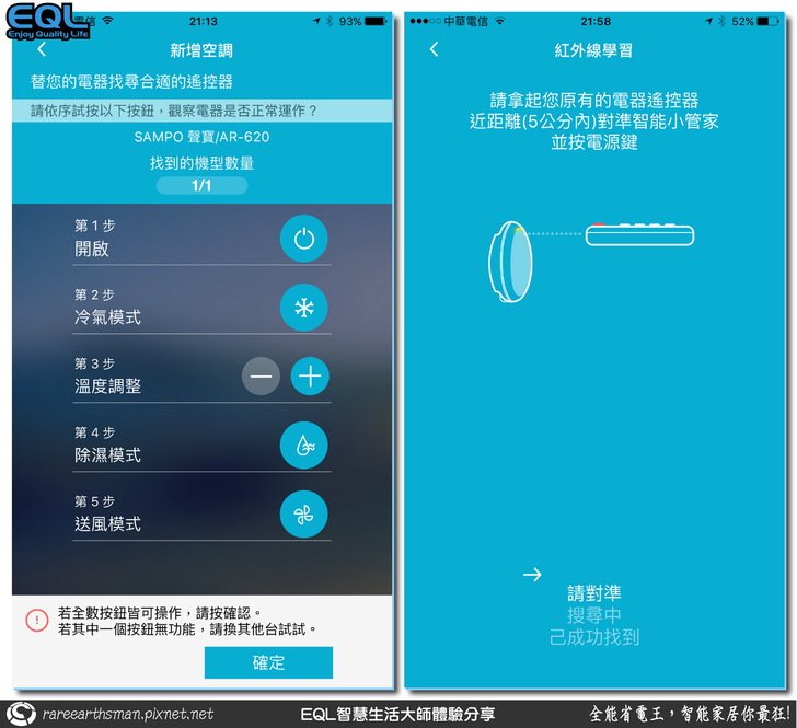 ▲因為內建裡面也沒有我的遙控器型號,所以我就找數字最相近的型號來做配對,說真的運氣真的很好,才試個3個型號就找到了一個可以用的遙控器模組,每一步驟都嘗試按看看,看功能鍵是否可以控制冷氣的動作,例如電源是否正常、冷氣模式、溫度調整、除濕與送風是否也都正常,都可以使用的話就找到了可以配對的遙控器了。如果這樣還找不到適合的遙控器怎麼辦呢?智能小管家還有遙控器學習的功能,把遙控器靠近小管家5公分的距離內,對準小管家並長按電源鍵,小管家就會自動開始掃描及學習,這也是可以找到可搭配的遙控器方法之一。