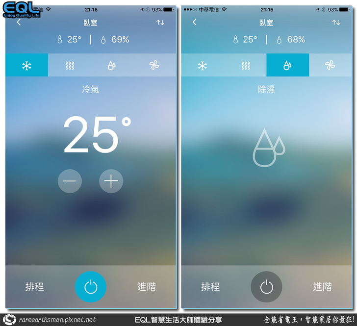 ▲遙控器配對成功之後,點選冷氣Logo之後就直接進入冷氣遙控器的控制頁面,分為冷氣、暖氣、除濕與送風這4個頁面,因為我家的冷氣並沒有暖氣的功能,所以只會顯示其他的三項頁面;冷氣頁面會顯示現在溫度,也可以調整冷氣的溫度,除濕功能就單單只有開啟與關閉功能,當然設定排程與進階設定也是可控制的。
