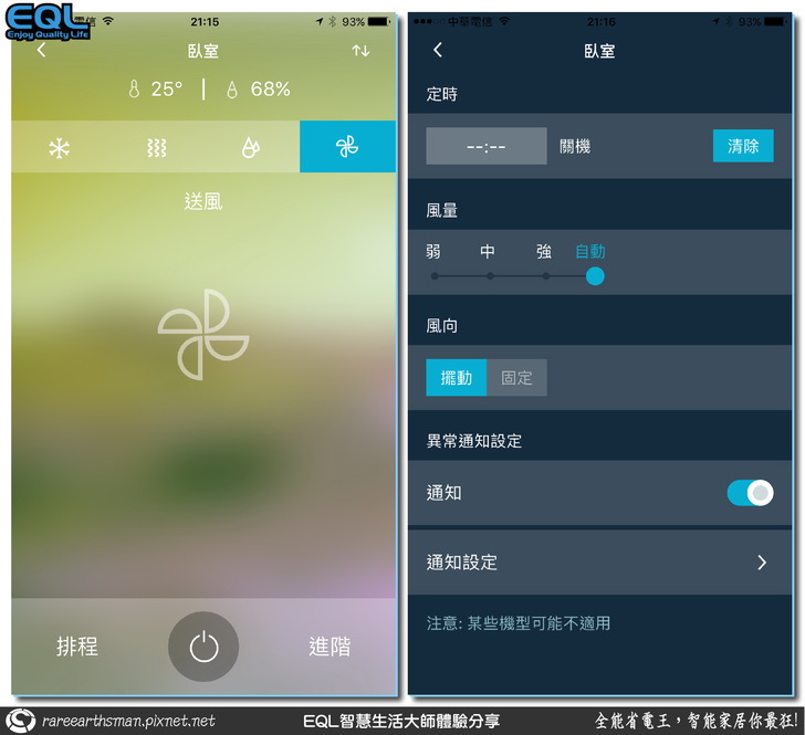 ▲送風功能與除濕功能是一樣只有開或關;在進階設定裡面除了可以設定定時的開關機,風量可以設定強中弱,風向也可以設定,甚至有通知的功能。
